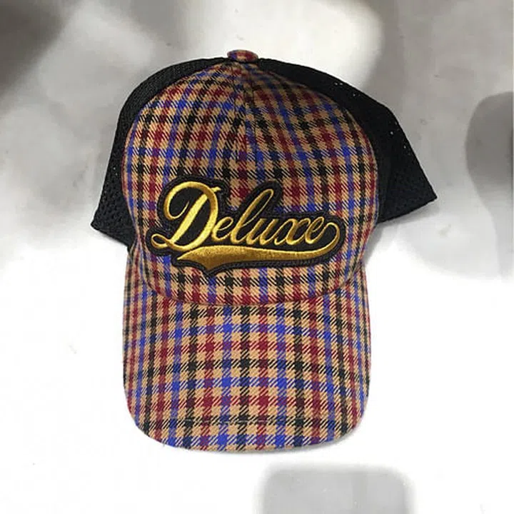 Scottish checks see a modern resurgence with this checkered 6-panel cap with strokes of electric blue and mahogany. The word Deluxe is gilded and pressed front and center, brandishing the brand name in the most stylish way possible.