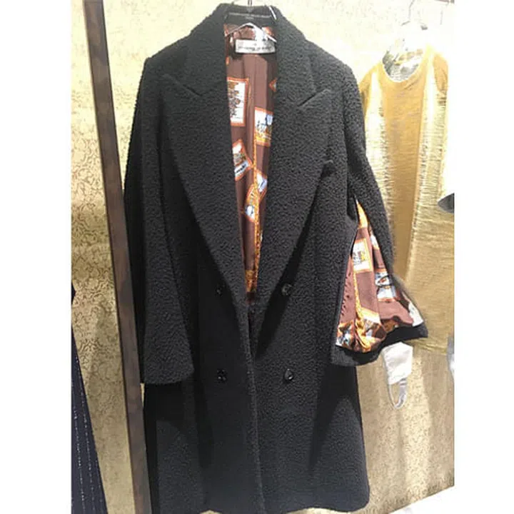 Surprise, surprise. On the literal flip side of this classic black fleece coat is an unexpected twist; vintage stamps with various landmarks across the world take the stage on the nut-brown inner lining.