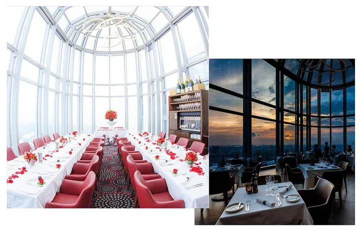 Located on the 55th level of ION Orchard and 218 m above ground level, this elegant location witha towering glass and metal framework ceiling is the perfect venue for urban dining and romanticism. Whether for an airy lunch reception or enveloped by the glow from the evening sunset, your your guests will get to enjoy the stunning panoramic view of Singapore, as they tuck into modern Australian fare by executive chef Jake Kowalewski, an acolyte of Luke Mangan.