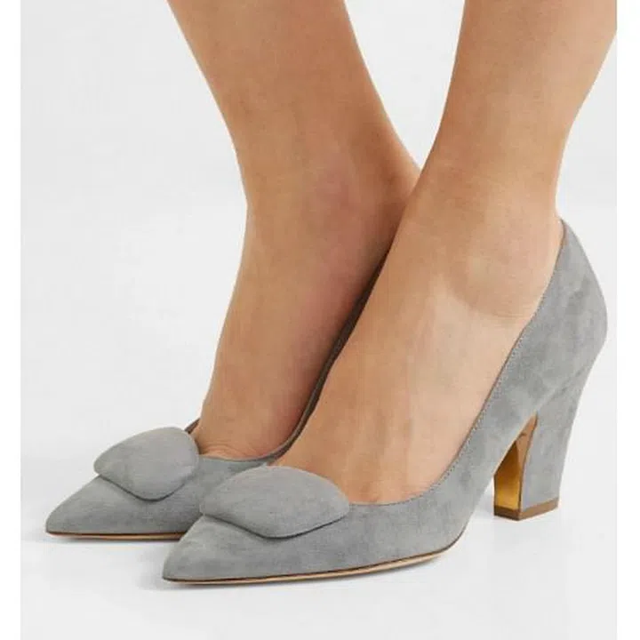 Rupert Sanderson's 'Pierrot' pumps are a fab heel to choose for a long day in the office - the chunky block heel allows more support to your foot than skinny stiletto heels. This pair feature a sleek pointed toe that's topped with the label's signature pebble-shaped embellishment and are made from luxe grey suede.