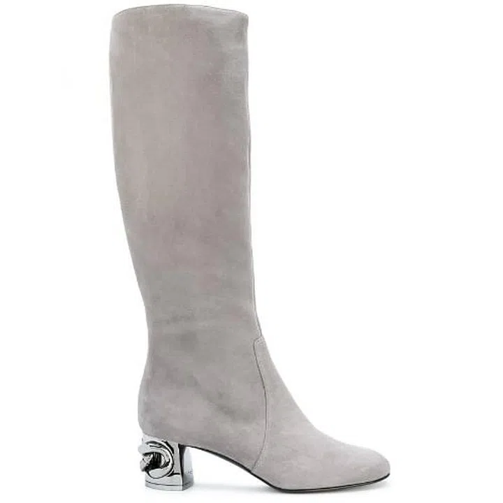 Italy is renowned for its quality and style in their clothing and accessories, and Casadei pieces are of no exception. These light soft grey under-the-knee boots are a fantastic pick (if we do say so ourselves). With that statement silver kitten heel, which was seen across all S/S ‘18 runways, and the super light block colour leather boot, they’re so chic and will match most things in your closet.