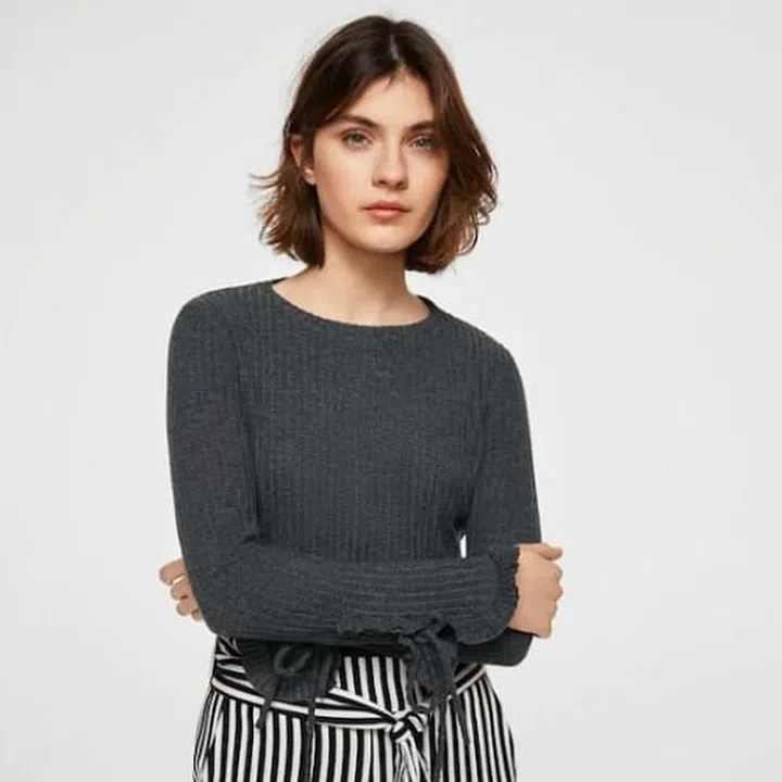 Made from ribbed knit fabric, this dark heather grey top has a high round neck and long sleeves, making it an easy win for appropriate office attire. The dark grey will work with most Asian skin tones as well as being able to be paired with bright colours and prints too.