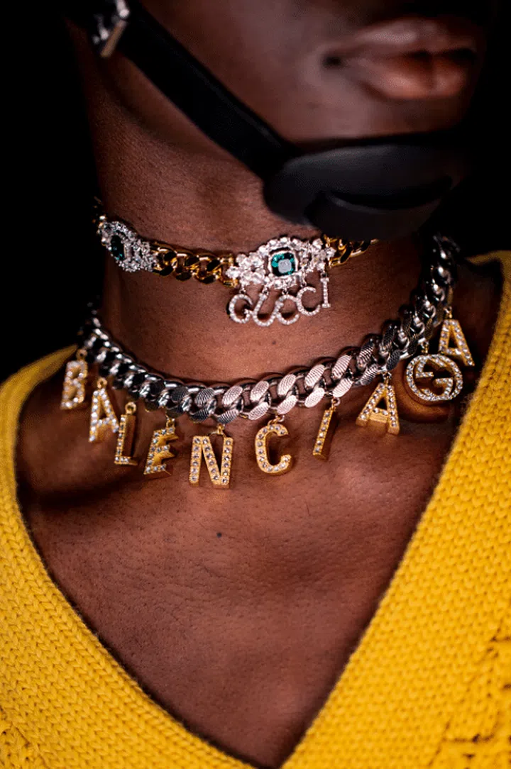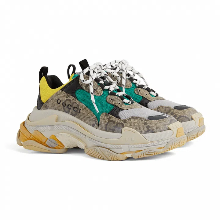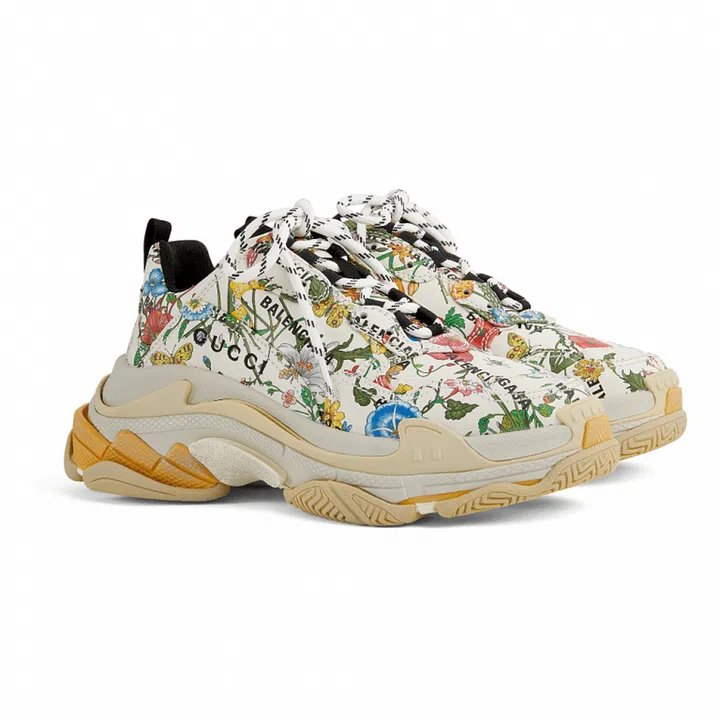 In the accessories department, Balenciaga’s popular Triple S sneakers make an appearance with uppers bearing motifs such as Gucci’s Flora print and a mash-up of the GG Supreme canvas with Balenciaga’s logo.