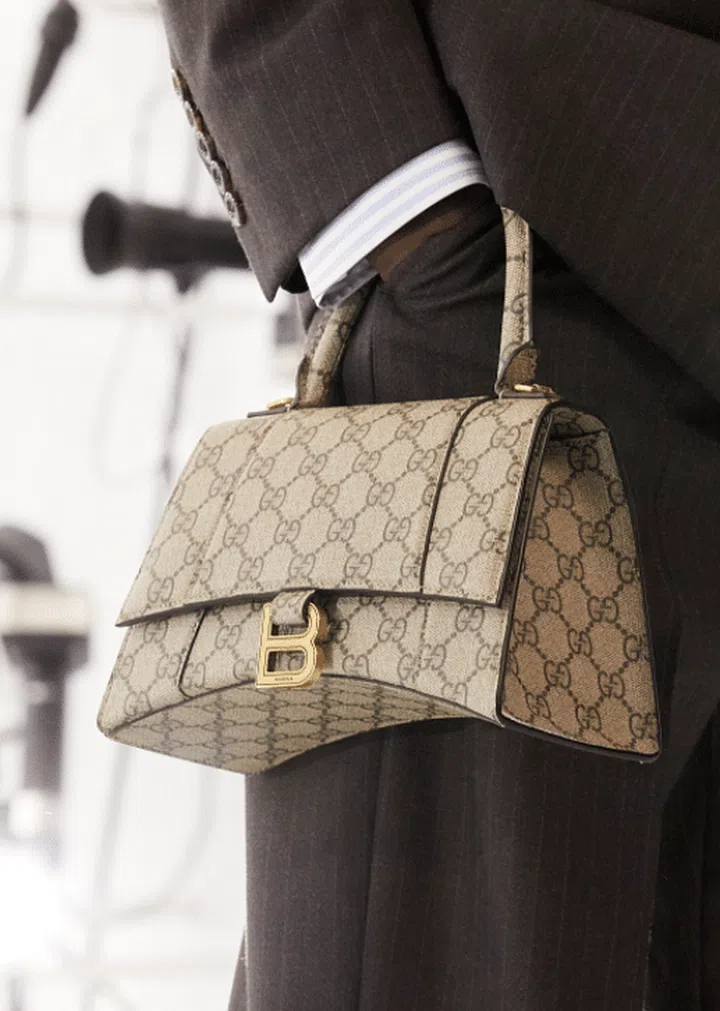 Balenciaga’s Hourglass top handle bag is swathed in the GG Supreme canvas.