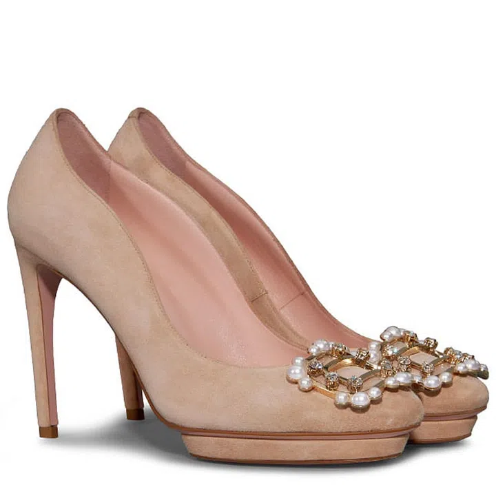 This blush pump is especially elegant and feminine with a crystal- and pearl-embellished metal buckle. Wear with a curve-hugging lace gown for a sophisticated look!