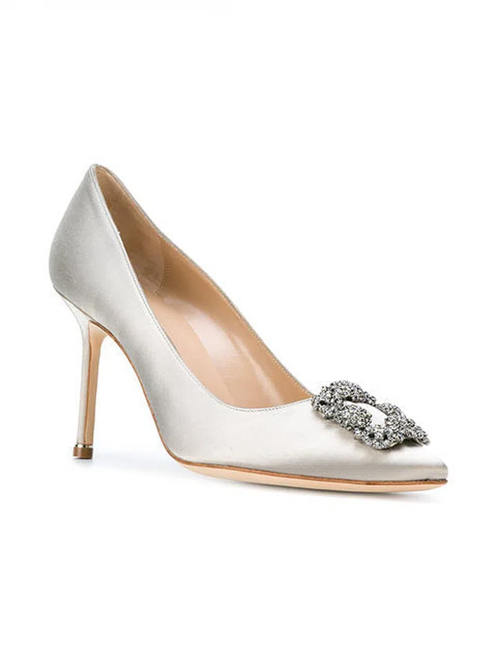Oozing vintage glamour, this iconic pump in lustrous silver silk-satin gives an understated sheen and is finished with the globally-recognisable Swarovski crystal-embellished buckle. In this case, less is more.