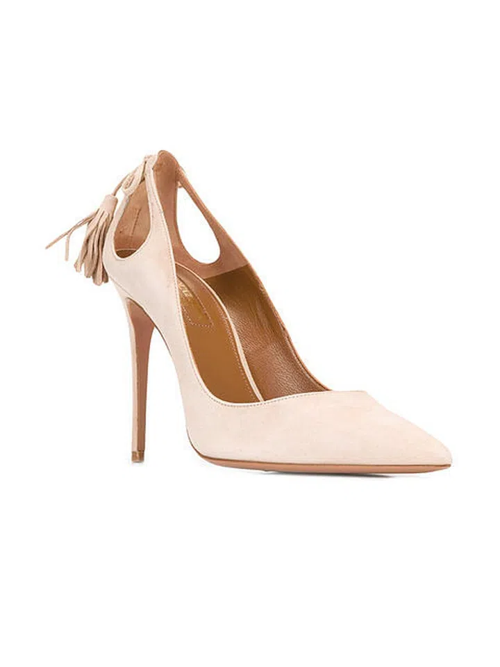 Want something that's not so over-the-top? This one is for you. This elegant nude stiletto gets amped up with a tear-drop cut-out and tassels for a classic with a difference.