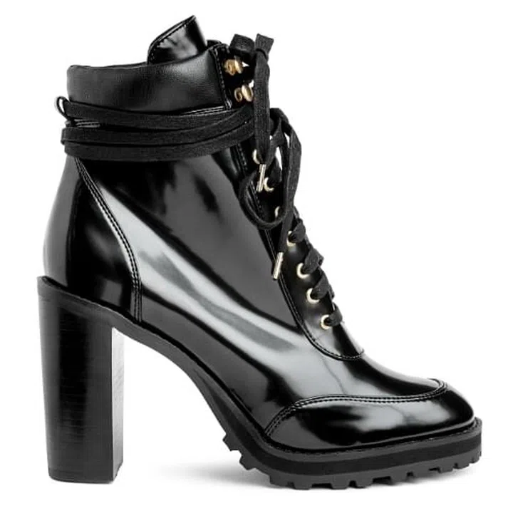 Oh how much do we heart these boots? The shiny black finish, the chunky heel (height and comfort, thank you for this!) and the ankle lace straps make these boots our must-buy this season. They are so versatile you can work these into pretty much any outfit... save a bikini on the beach (definitely not going to work).