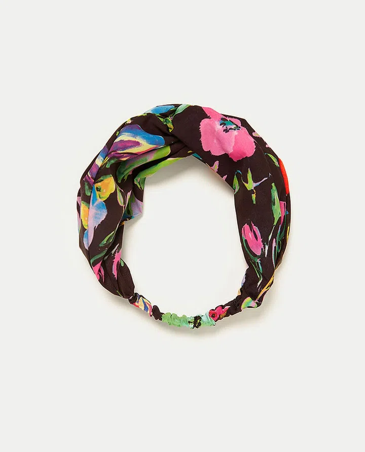 Add something a little unique to your style with this floral print turban-style hairband. Bright floral print overlays a black background on this headband with front knot detail.