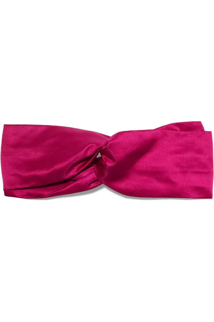 This lustrous fuchsia silk-satin headband has been twisted into an elegant knot and trimmed with small gold leather detailing. Wear with hair scraped back, looks great with subtle gold earrings.