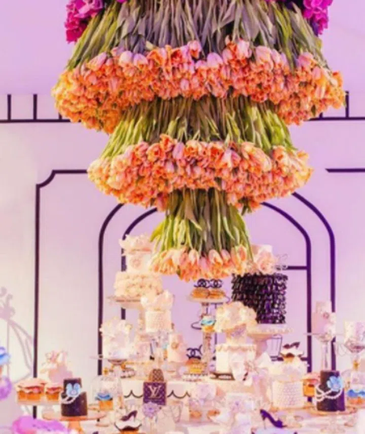 A dramatic chandelier of vivid tulips will instantly give your dessert table, and wedding, more wow.