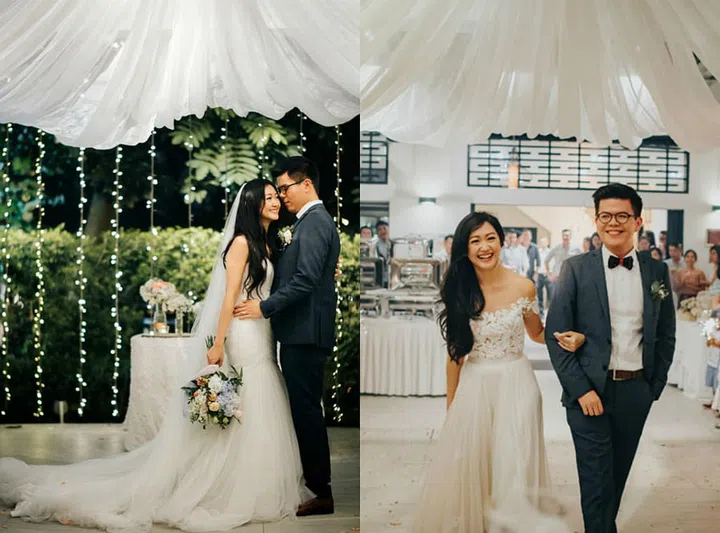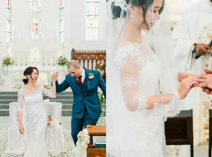 For her colonial-style nuptials at Tamarind Hill Restaurant, Evelyn kept things sophisticated and classy with a vintage-style lace sheath that complimented her lithe figure. A soft bun accented with a cream-coloured floral hair clip, and dainty pearl earrings completed her romantic look.