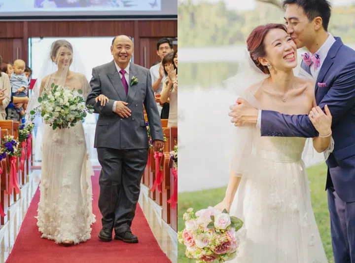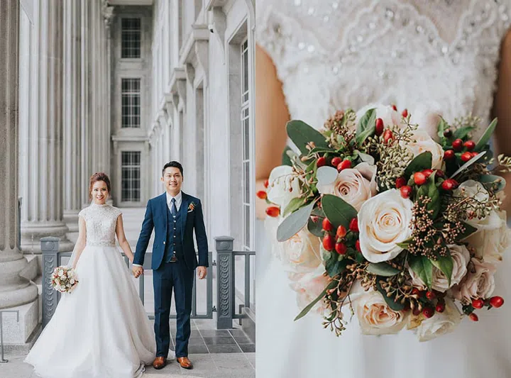 Makeup artist, director and co-founder of 27A Co, Marie Soh, took the sleek, fuss-free approach with a curve-skimming number, accentuated with delicate lace sleeves, and a bright pop of colour (vivid floral appliques sewn near the bust of her gown).
