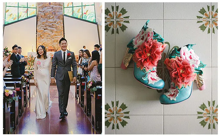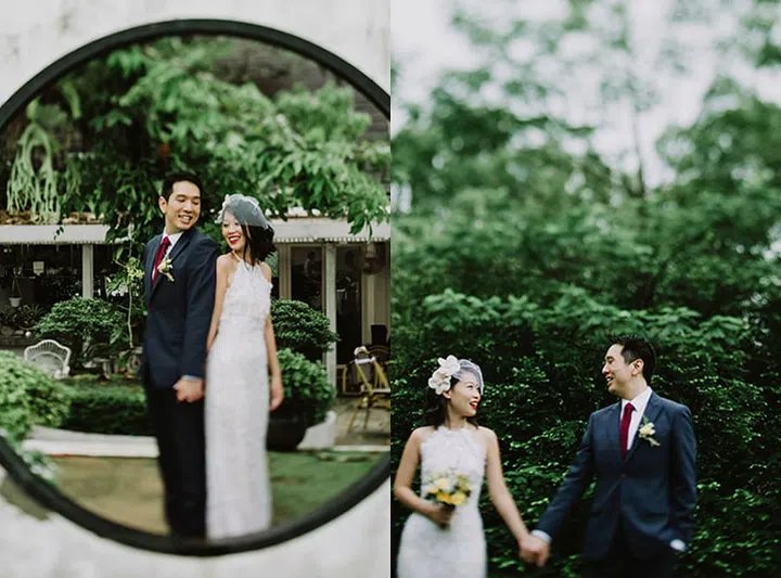 For a pretty cafe wedding, especially one that's outdoors, it's best to keep it light and casual - a heavy ballgown will only leave you sweaty and uncomfortable in our humid weather. Jeanne went for an elegant lace halter in a white and soft blush hue, then turned up the vintage charm with a bold red lippie and a birdcage veil.