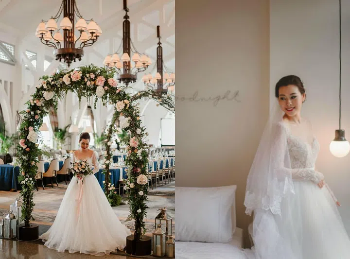 Tracie's lavish ballgown with intricate and beaded details was just right to go with her festive Christmas-themed wedding on the eve of the holiday itself. The high neckline paired with shimmery beadwork also evoked a subtly wintry vibe.