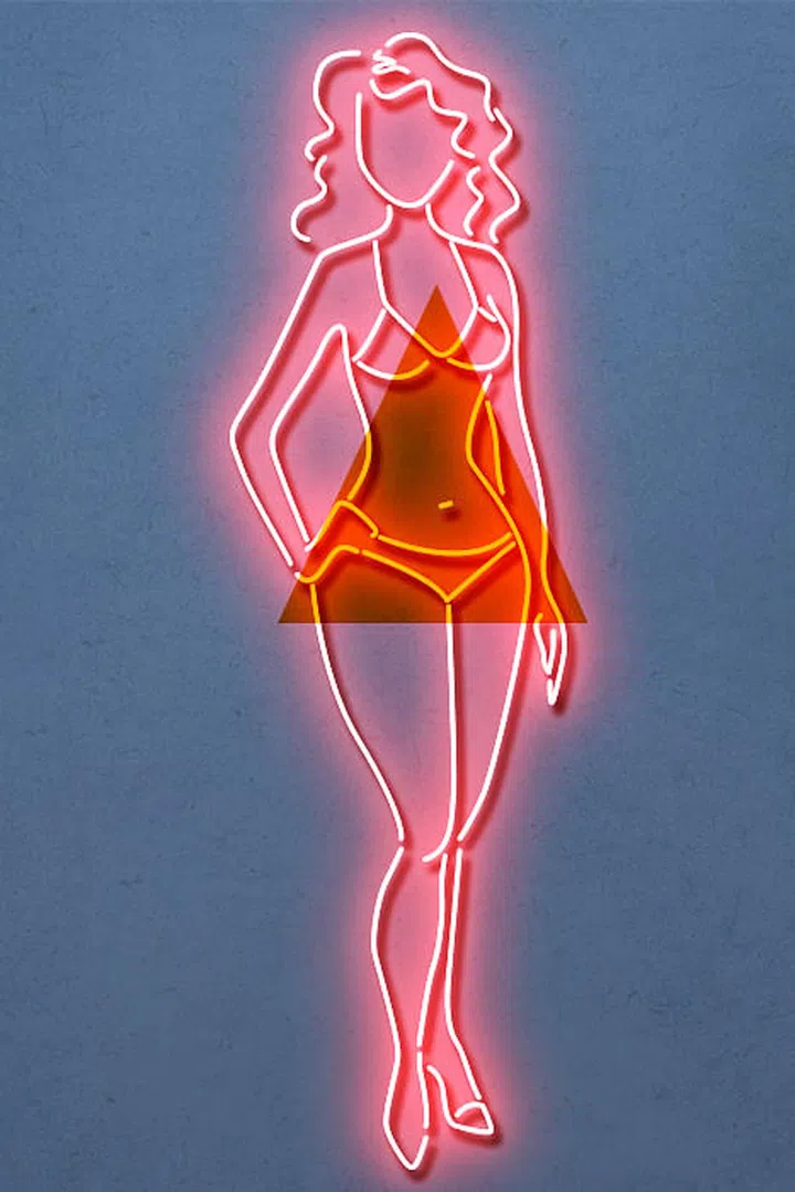You’re a pear shape if your lower half is greatly larger than your top half. Most pear shapes carry their weight on their thighs and rear, whilst their top halves are slight in comparison. That being said, your bust will be large, which differentiates you from a triangle (see triangle slide for comparison).