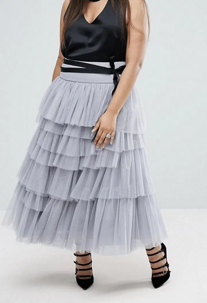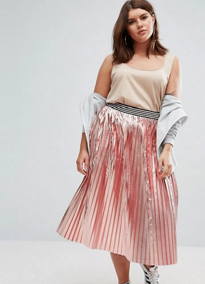 Avoid pencil skirts (they’re too tight and draw all the attention to your bum and thighs) and instead look for skirts that start at your waist and finish either at your knees or your ankles.