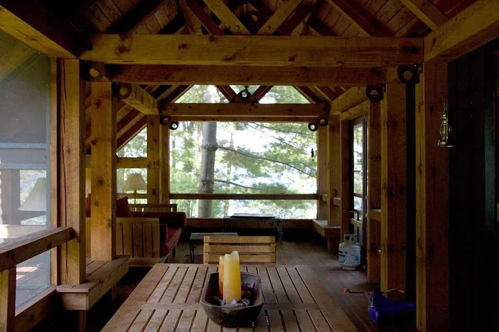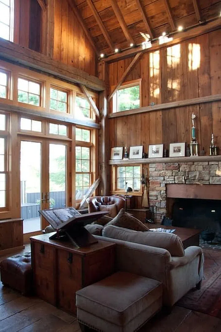 The rustic-looking home offers charming views of the lake, as well as the surrounding white pine, maple and birch forest.