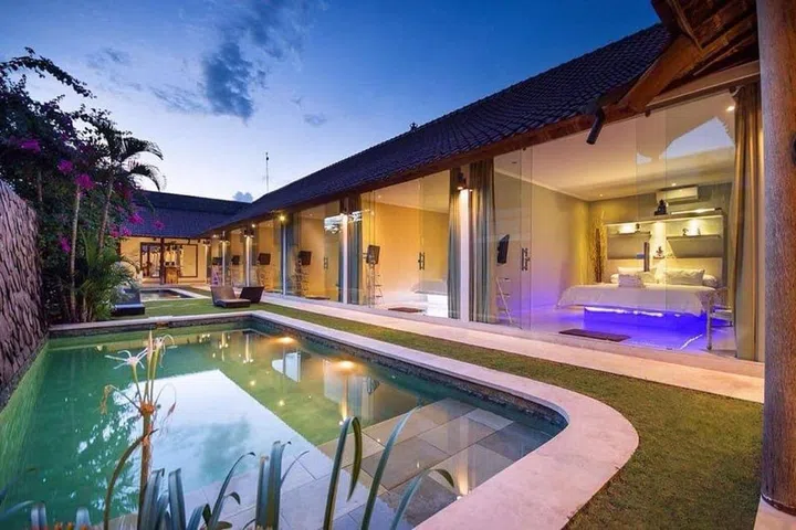 The villa fits 16 guests, has nine bedrooms sand 16 beds, and provides outdoor amenities such as umbrellas, lounge chairs, tables, as well as a pool for a casual reception with your loved ones. See www.airbnb.com.sg/rooms/2279994?sug=50 for more information.