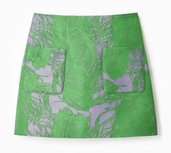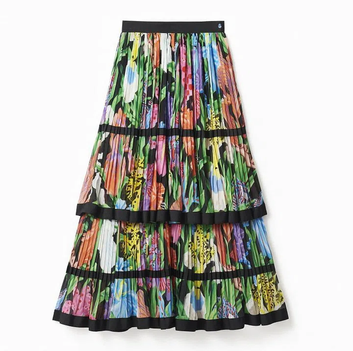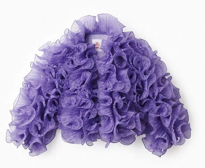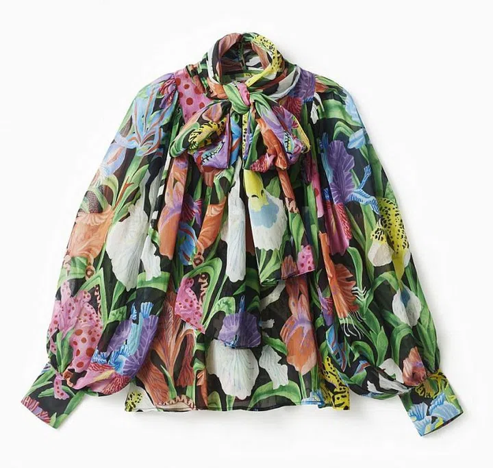 A former interior designer, the centenarian is known for a fashion aesthetic that is anything but restrained. And you can expect the same signature eclecticism from her tie-up with H&M. The line-up is an explosion of vivid colours, textures, patterns and cuts — for instance, there’s a jacquard suit with peapod embroidery and pearl peas, an extravagant ruffled top, and a flouncy tiered skirt and blouse co-ord in a beautiful iris flower print. You’ll even find a bathing suit printed with a motif of Apfel’s signature oversized glasses.