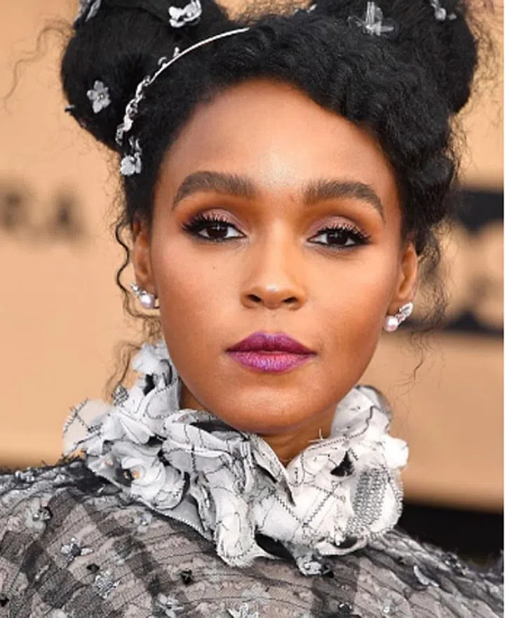 Brides with tan skin, take your cue from Janelle Monae. The sing songwriter's vivid violet lips make for a fun bridal look, which she paired with a blend of pastel pink and mauve shadow.