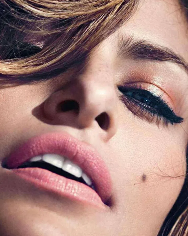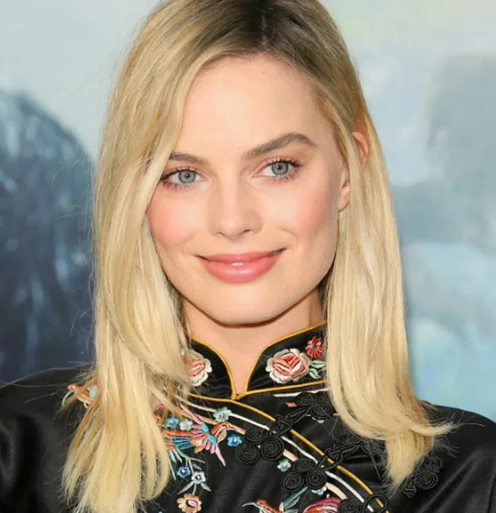 Margot Robbie looks absolutely radiant in this peach-based look with a light flush on the cheeks, a touch of pale pink on the lids and a glossy peach lippie.