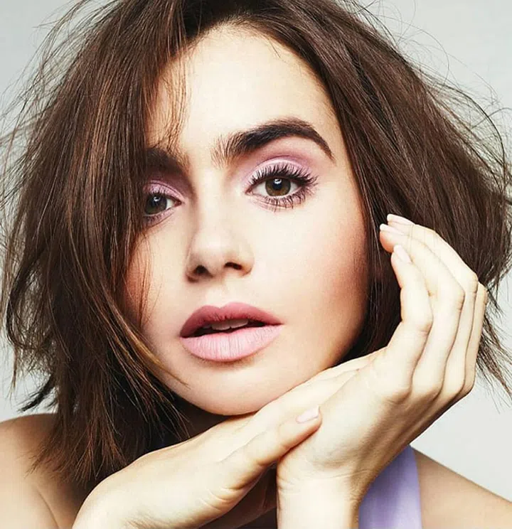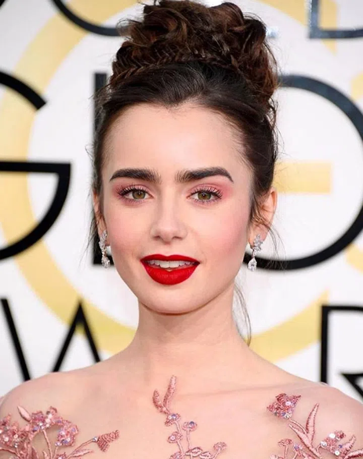 Matte crimson lips gave Lily Collins' otherwise romantic all-pink look a striking and glamorous twist. Instead of wearing bright red lips with black winged eyeliner or minimal eye makeup, try a wash of powdery pink like she did.