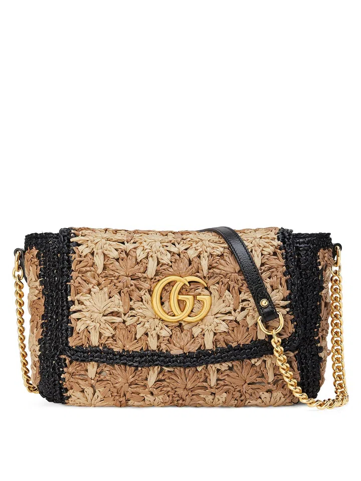 More commonly seen is the black quilted matelassé leather version of the GG Marmont shoulder bag that's a favourite of Dakota Johnson, Alexa Chung and Elle Fanning. Gucci refreshes its coveted 'GG Marmont' bag in lightweight raffia just in time for summer. Intricately woven to resemble flowers, it's outlined in black to match the leather panel on the chain strap and adorned with the label's signature interlocking plaque. The canvas-lined interior comfortably fits a full-sized wallet, sunglasses and even a book - if you love reading.