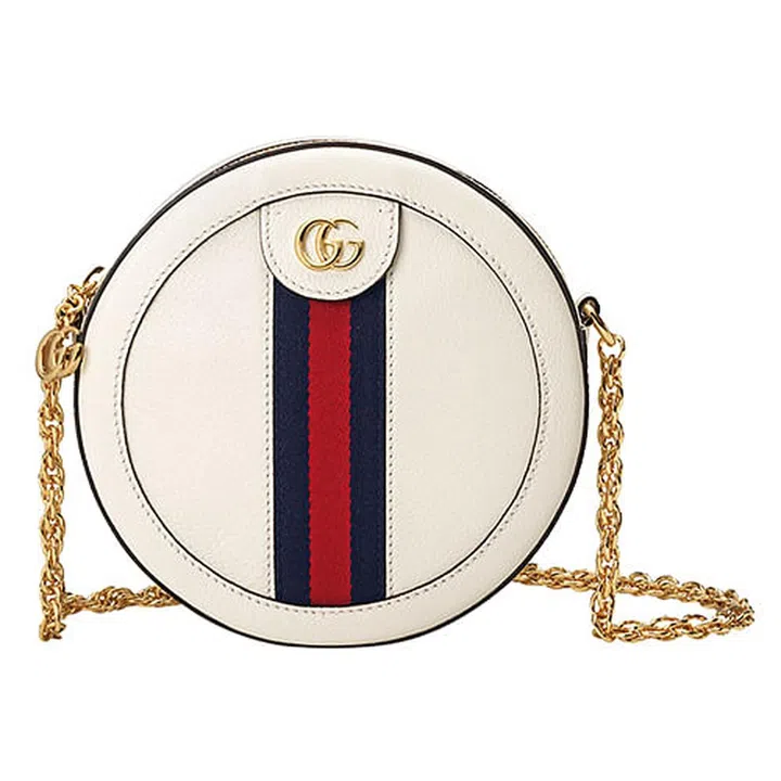 It's no secret that Gucci's Alessandro Michele is fascinated by snakes, which is why this 'Ophidia' shoulder bag in a miniature round shape derived its name from a serpent in ancient Greek mythology. This playful addition to the world of Ophidia has been made in Italy from plush navy with burgundy leather trims and coordinating webbing. The iconic 'GG' plaque and chain strap are both a classic gleaming gold. The accessory is enhanced by a petite play on the Double G, an archival Gucci code from the '70s that appears atop a tab detail.