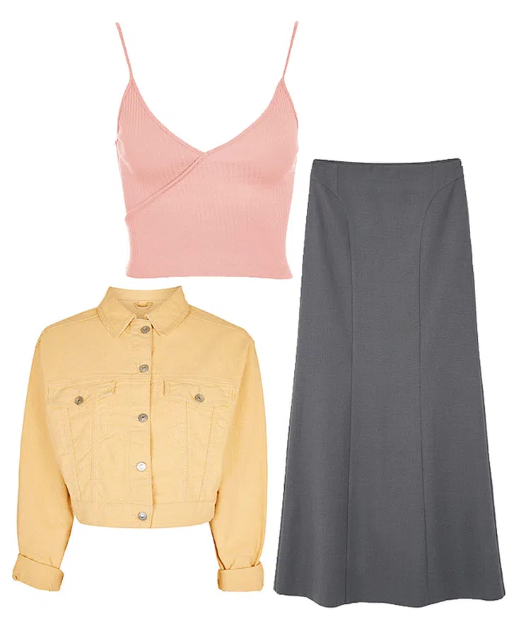 Shoutout to our favourite neapolitan ice cream, anyone? This cheery combination is perfect for a chill weekend. The cool yellow denim jacket adds a bit of character and vintage flair to an otherwise girly coordinate; simply throw on your favourite sneakers to seal the deal. Photo: Topshop, Mango