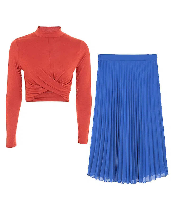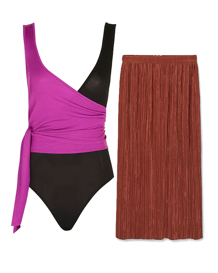 Oh, how we love a sexy piece that already does all the colour-blocking for us. Throw on a pleated copper brown skirt to balance out the fitted silhouette of the bodysuit and amplify the glam feel. Now we’re ready for a party! Photo: Topshop, Mango