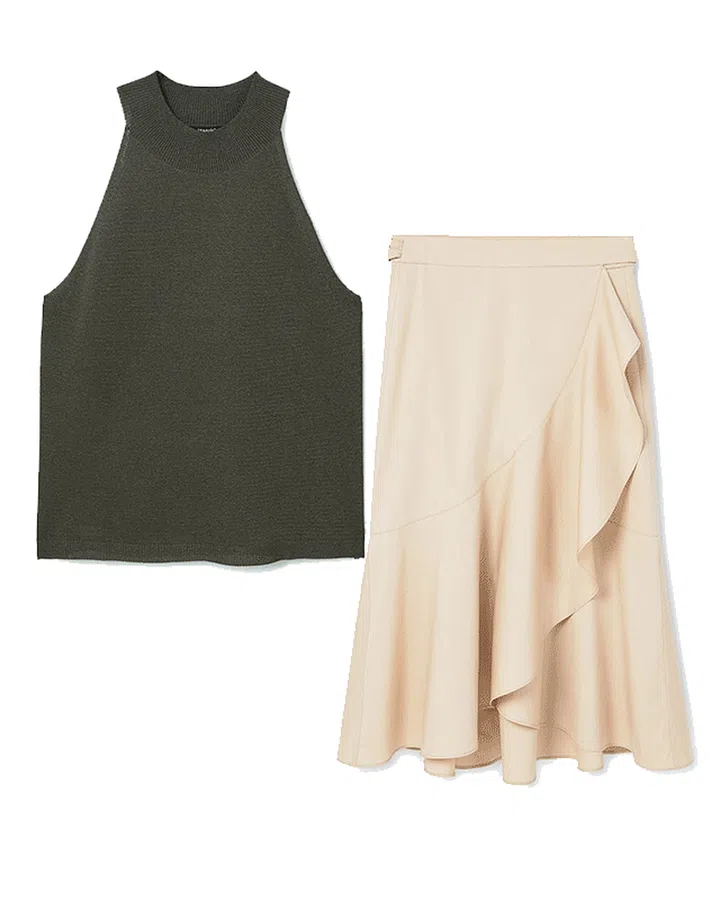 Look effortlessly put together with this green and beige ensemble that’s fun but still appropriate for the office. Colour-blocking for work doesn’t have to be boring when you can count on details like ruffles and a waist-tie to amp up the luxe factor. Photo: Mango