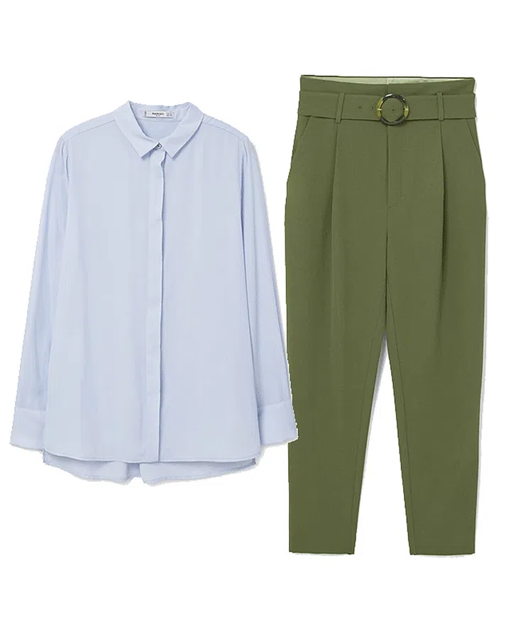 Blue and green are right next to each other on the colour wheel, which makes this colour scheme so very easy on the eye. Look impeccably smart with a pop of colour (or two) – a collared blouse always does the trick, and you’d do well to complete the look with this pair of khaki pants with a waist-accentuating belt buckle fastening to give you that much-needed definition. Photo: Mango