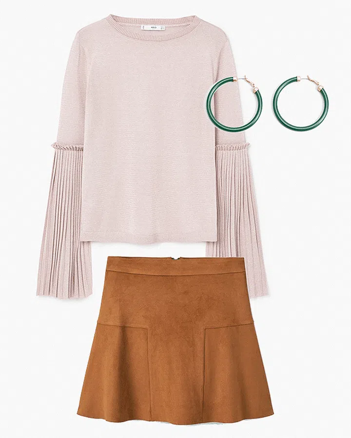 Pink and brown is a rather safe option, but the key lies in choosing pieces with interesting details and textures. This sweet pink sweater comes rigged with pleated flared sleeves (a great visual ‘prop’ for OOTDs, we must say) and the skater skirt boasts a buttery soft finish. Spice things up further by adding a pair of green hoop earrings and you’re all set to impress. Photo: Mango