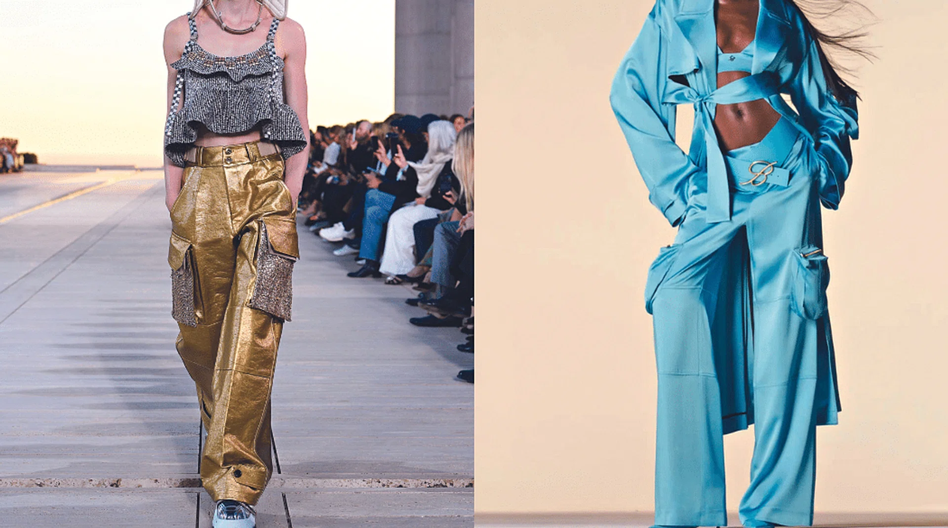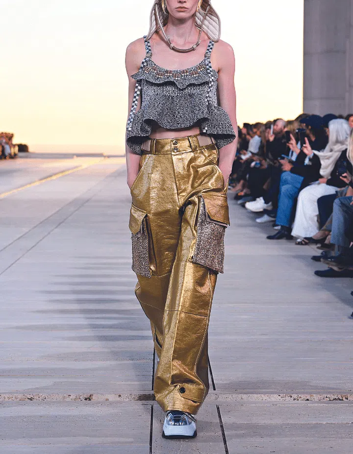 Another stunner is Nicolas Ghesquiere’s posh creation for Louis Vuitton: gold cargo trousers in crinkled leather with contrasting patchwork metallic pockets. Paired with a textured ruffled crop top, it’s refreshingly modern, eclectic and effortlessly glam – a look that’s sure to be snapped on a Gen-Z celebrity soon.