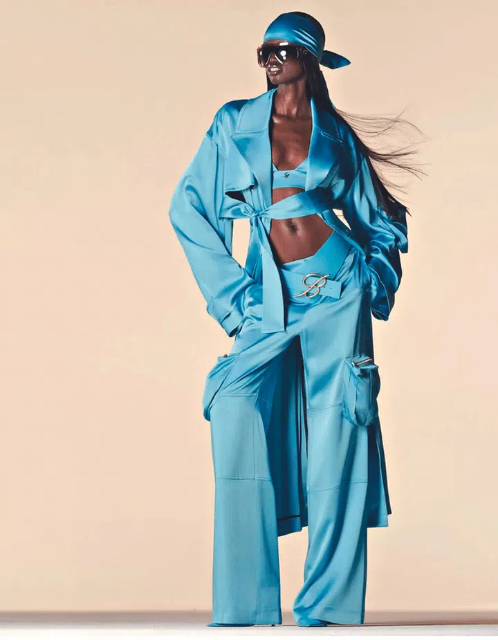 At Blumarine, iterations of the multi-pocketed pants have become one of the brand’s signatures, under the helm of 32-yearold creative director Nicola Brognano. The Italian designer showed off cargo trousers paired with a chic, frilly long-sleeved blouse – all in satin.