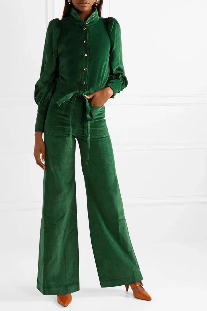 Throwback to the groovy ’70s with this disco chic Anna Mason emerald green corduroy jumpsuit that sports puffed shoulders and a wide-legged cut. Pair with brown pointed heels and a brown shoulder bag to really emphasise the earthy colours of this number.