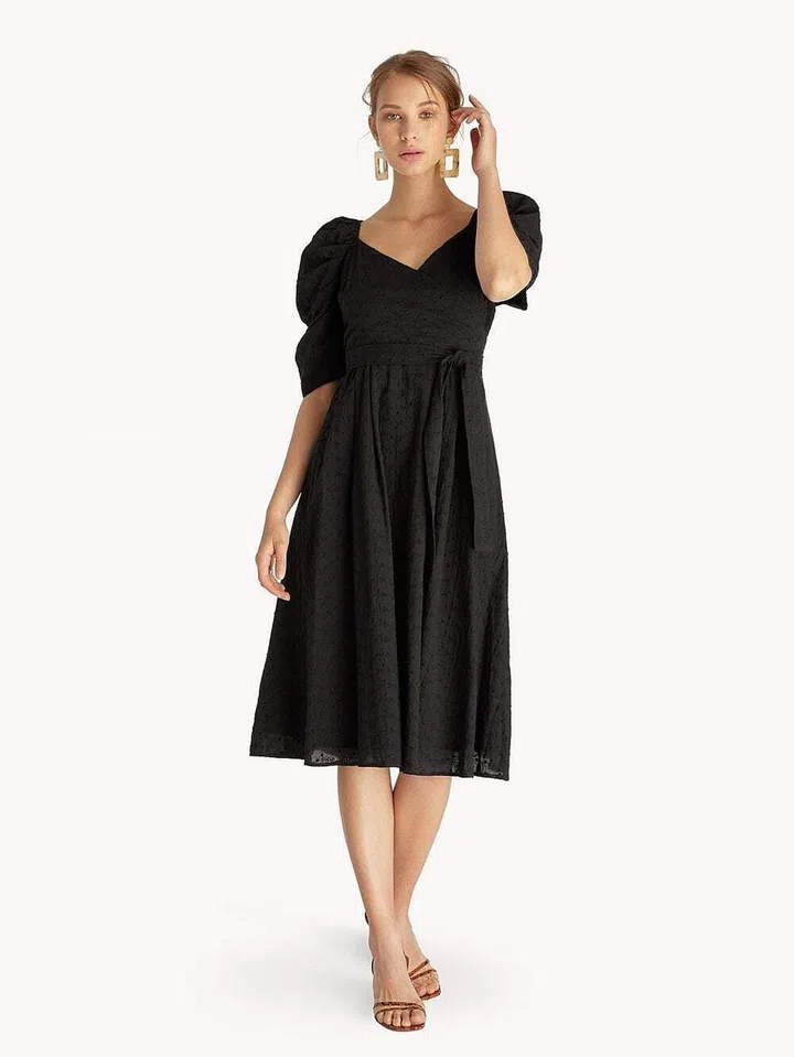 Boasting an eyelet design and puffed sleeves, this black dress is girly and sweet, and suitable for both work and play. We love that you can cinch your waist with the ribbon tie, enhancing your waist and chest. The empire silhouette also gives it a nice flowy movement while concealing any food baby you might have.