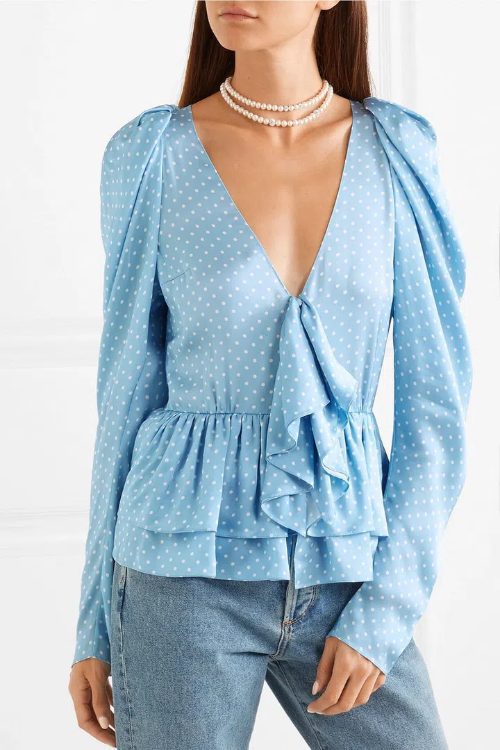 Created exclusively for Net-a-Porter, this retro-esque v-neck peplum top — complete with ruffles, puff shoulders, polka dots and a sky blue colour palette — gives you the perfect weekend date look when matched with a simple pair of three-quarter-length cream straight-cut pants. Finish with a crossbody bag and mules.
