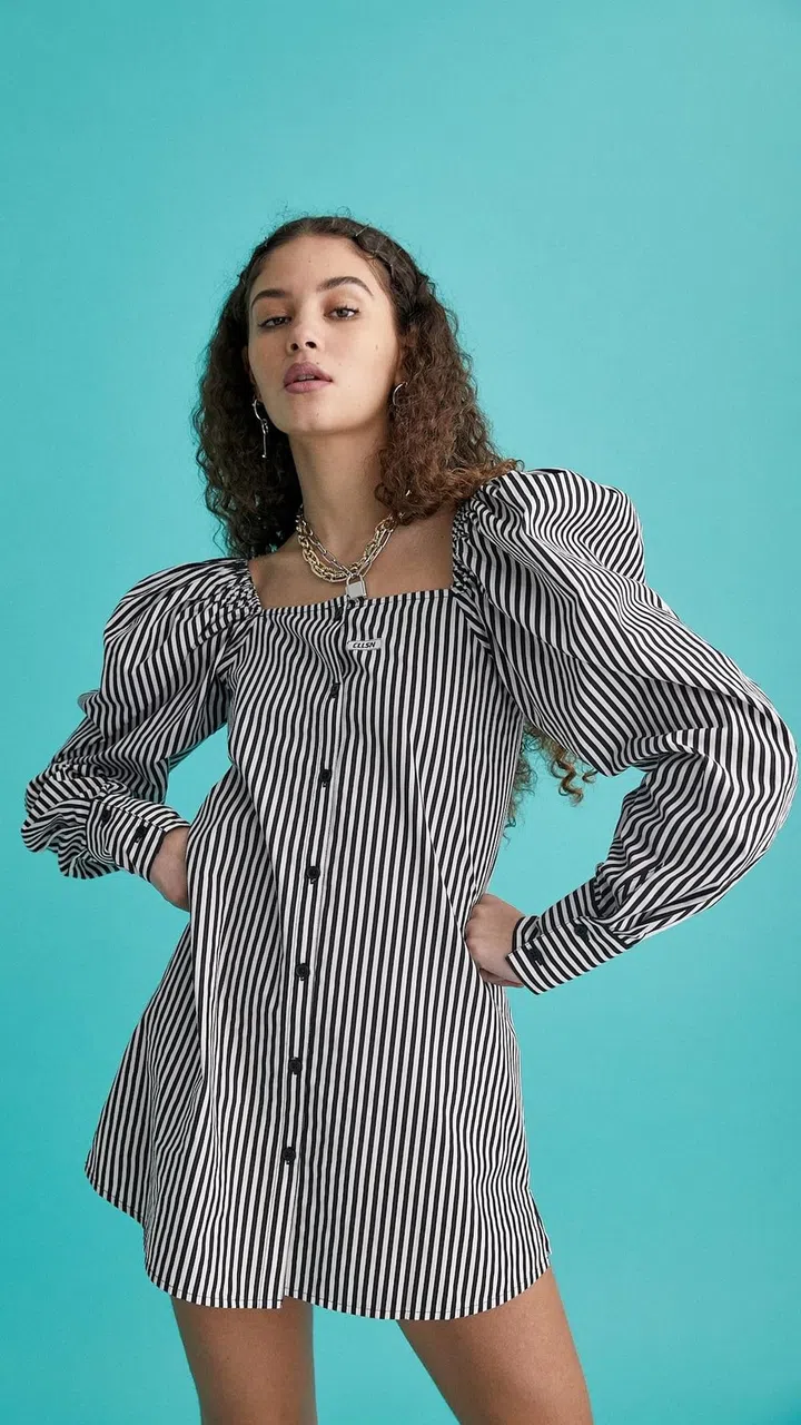 Need a striking dress to really wow your partner for your next date night? Look no further than this black and white striped Collusion design. The puffed shoulder adds drama while the leg-baring mini skirt shows off your long, toned gams. Best paired with boots.