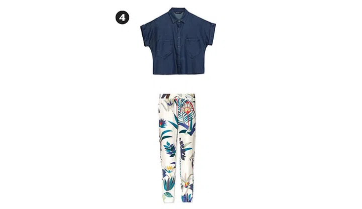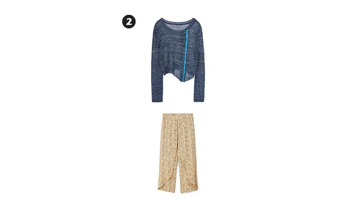 2. Blue cropped sweater, $110.80, iROO and trousers with green leaf print, $34.90 (usual price $69.90), Mango