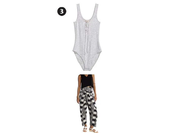 3. Lace-up bodysuit, $49.90, H&M (available from mid-August) and cotton black and white pants in Raka Raven, US$119 (S$160), Matter
