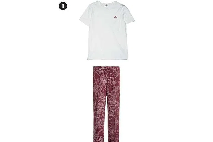 1. White crew neck tee, $99, future classics by Kapok and maroon pants with white face prints, $87 (usual price $290), Bimba Y Lola