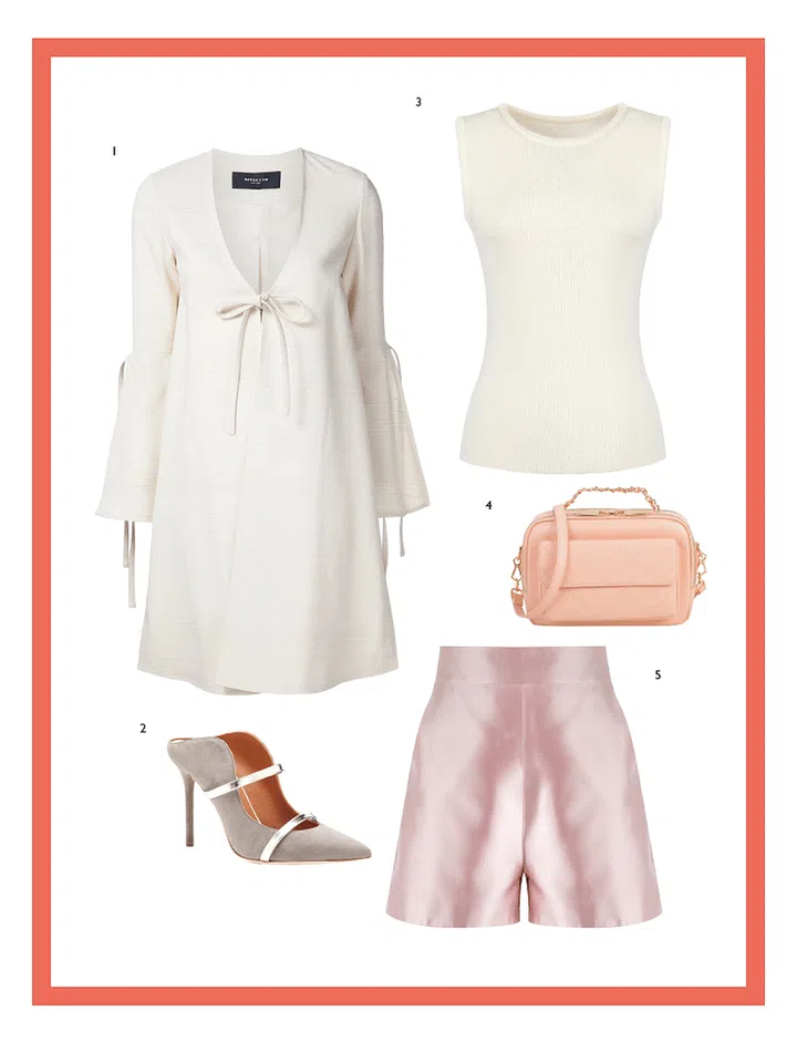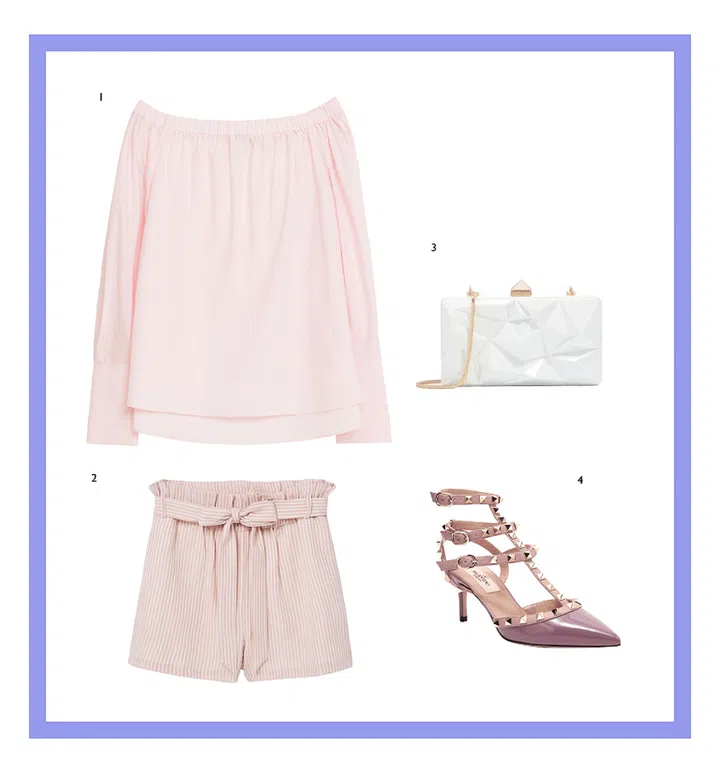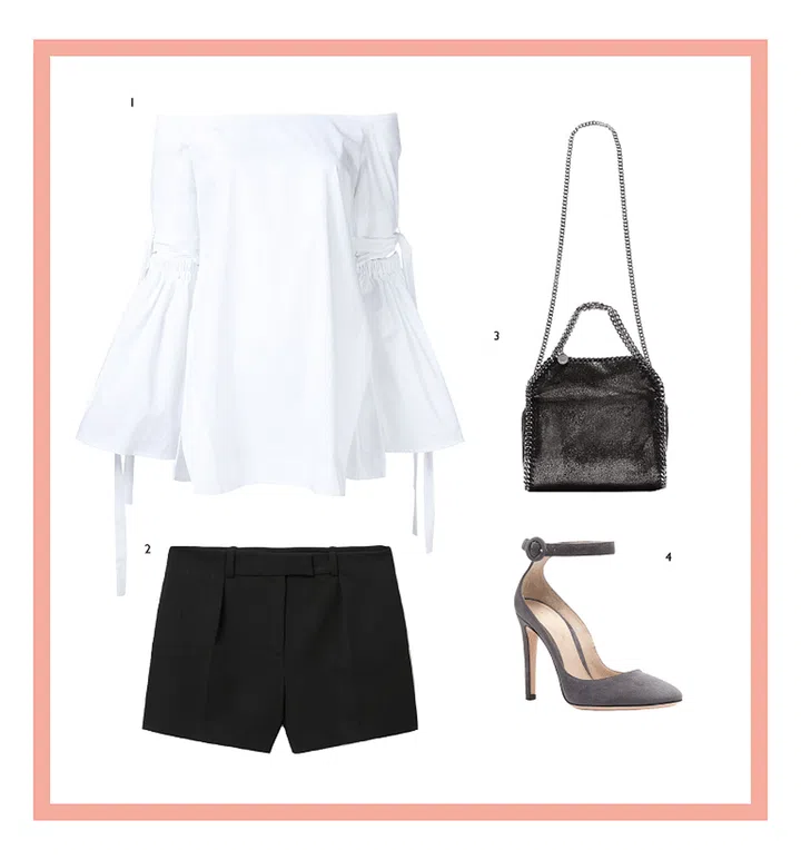 Off-shoulder tops give the perfect feminine yet sophisticated edge to tailored shorts. Complete the outfit with a matching bag and neutral heels and you’ll be chicest woman in your squad. Click next to check out how to style them!