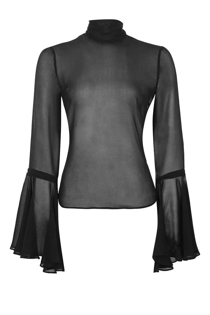 Elevate the modern romance trend in this eye-catching black blouse – there’s just something about the sheer material that’s sexy without being over-the-top revealing. Go for a lacy camisole beneath or wear with a crop top / bra if you’re feeling bold! We can’t decide what we love more: the billowy full circle sleeves or the sash detail at the back.