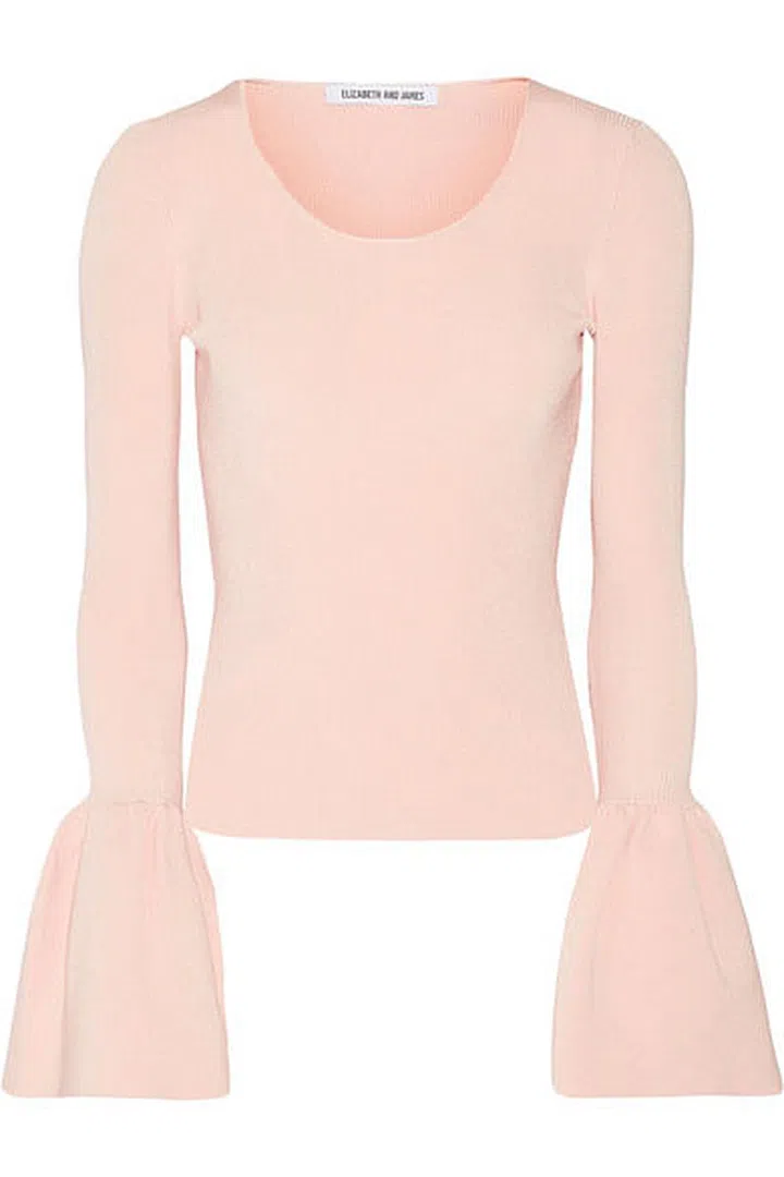 How sweet is this blush pink knit top with oversized bell cuffs? Keep the colour palette soft and elegant with a white skirt and sneakers and you’re all set.
