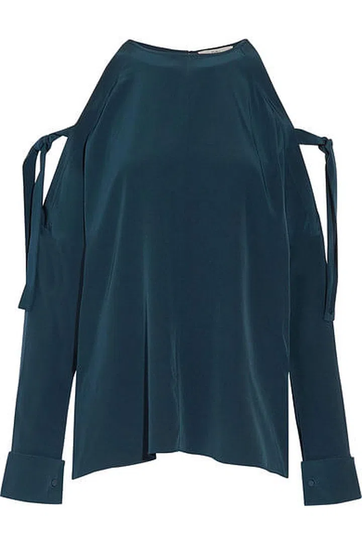 We’re so digging this luxe silk crepe top in a rich petrol hue. These are not your usual shoulder cutouts – they’re adorned with delicate ties for that dainty touch. The blouse is finished with extra long sleeves punctuated by tonal cuff links. Neat.