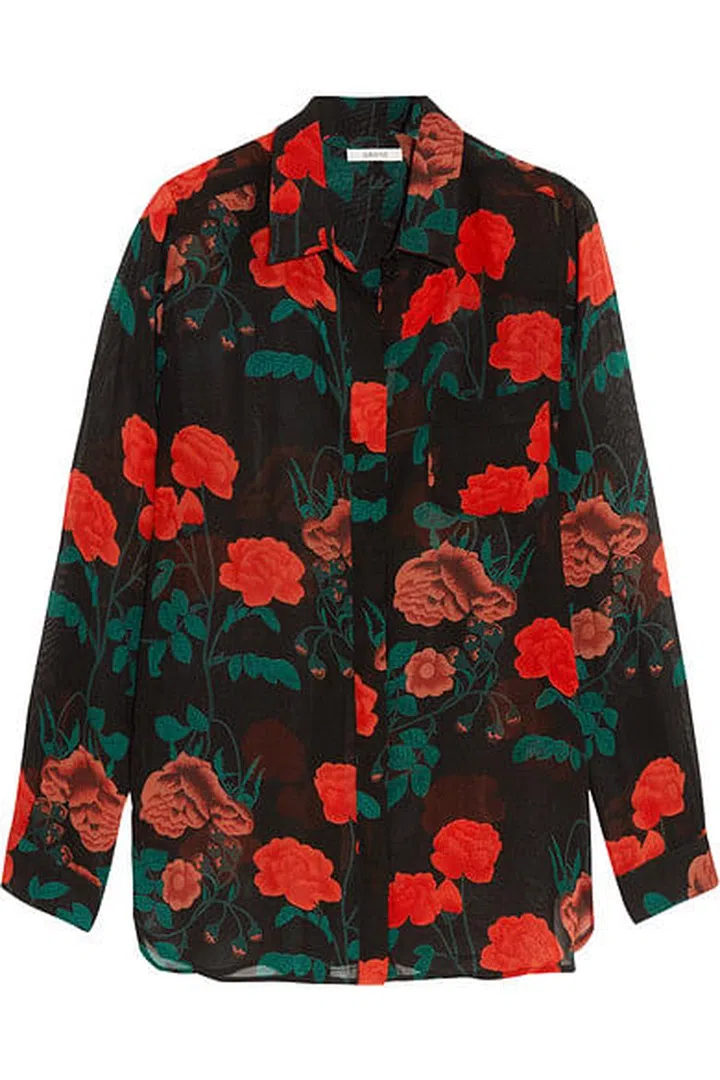 Check out this vibrant shirt made from sheer black georgette that's printed with vivid red roses! This piece has dropped shoulders for a loose fit and is minimally detailed with a breast pocket. Wear it over a lacy camisole and tuck it into your favourite jeans for the perfect celeb off-duty look.