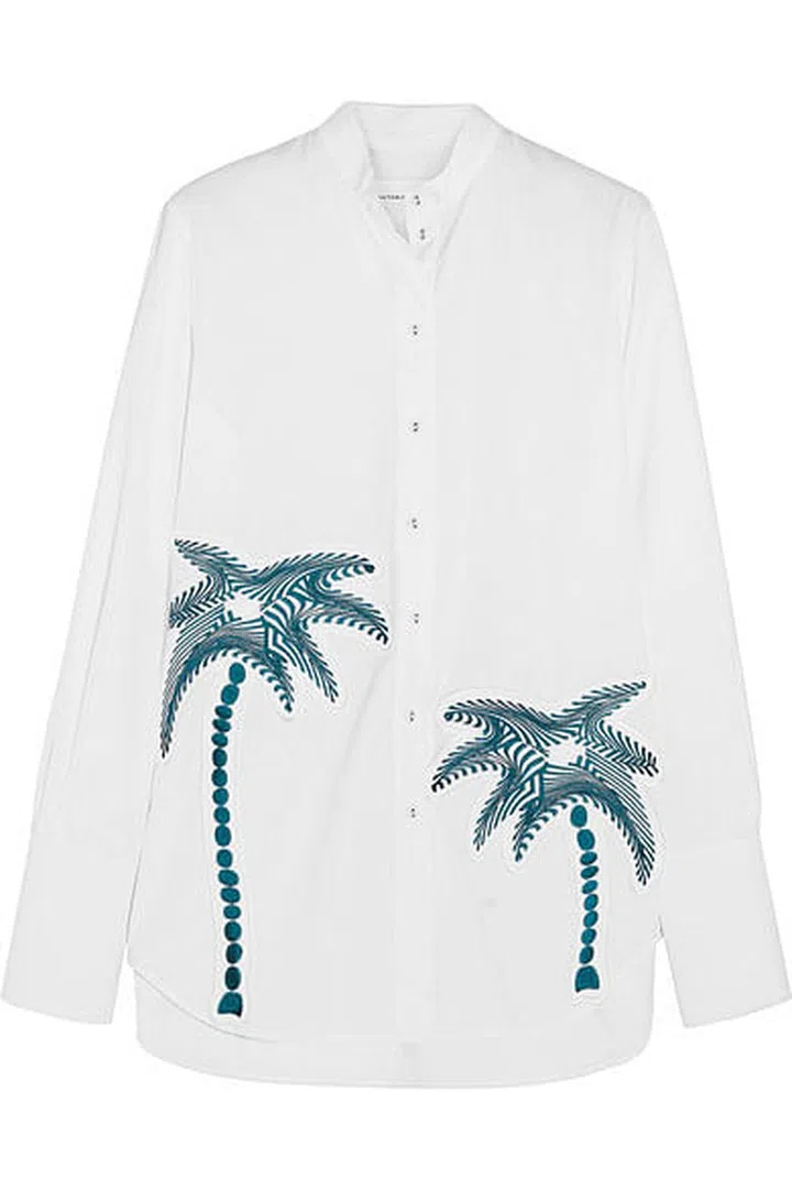 Ah, the classic white shirt is re-imagined with embroidered teal palm trees, offering us idyllic images of a beach vacation. Don’t tuck in the shirt so you can flaunt the cute palm trees in their full glory. And just look at the mandarin collar!
