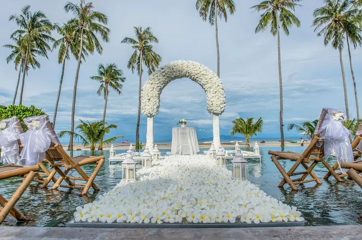Couples can celebrate their union along the resort’s expansive 800m-long sandy shoreline, then chill out at the beachfront pool and Wana Spa. All the bars and restaurants come with breathtaking sunset views, perfect for cosy dining experiences.